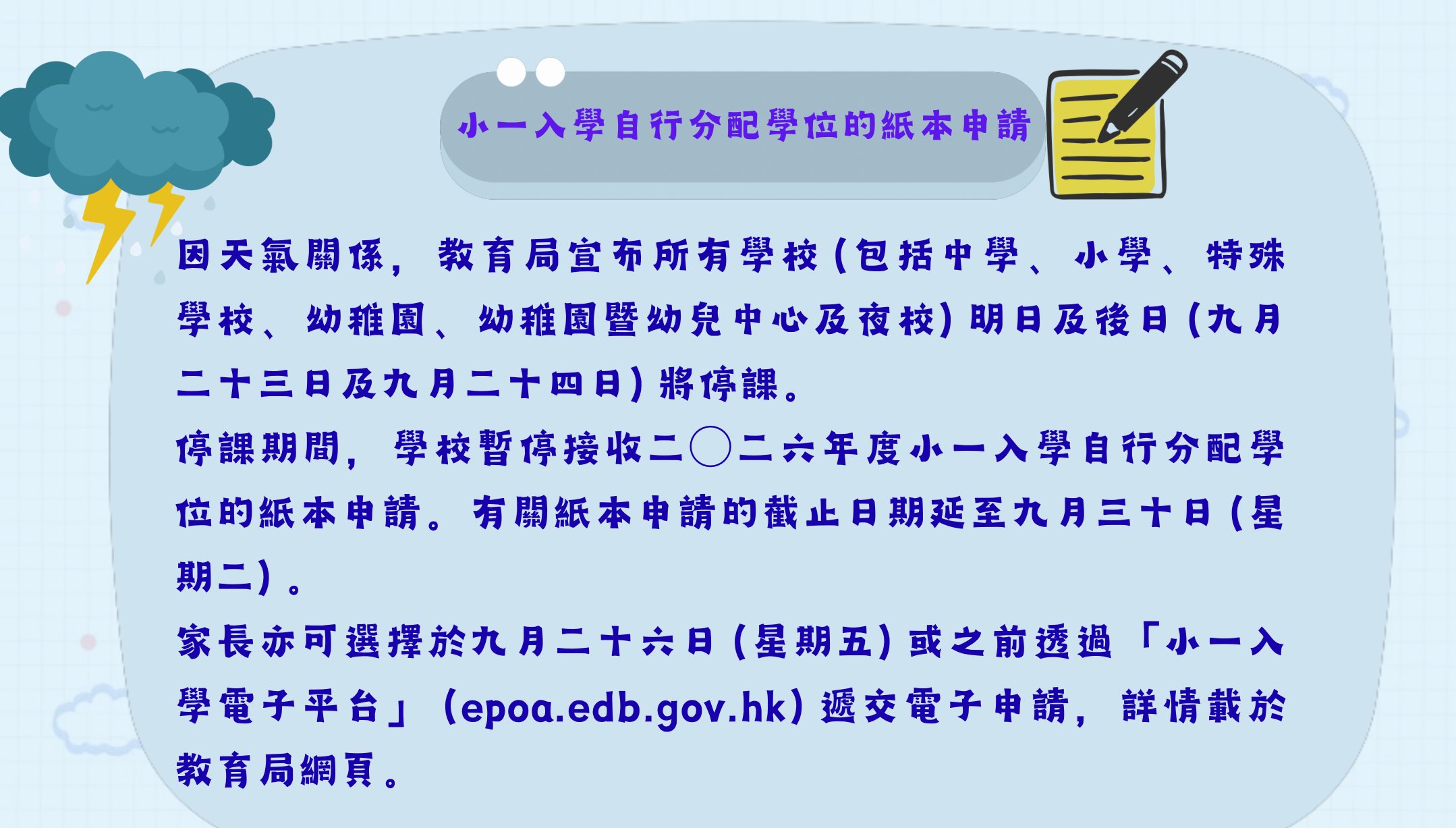 🔹 Please closely monitor the storm updates issued by the Hong Kong Observatory and the class arrangement announcements from the Education Bureau.